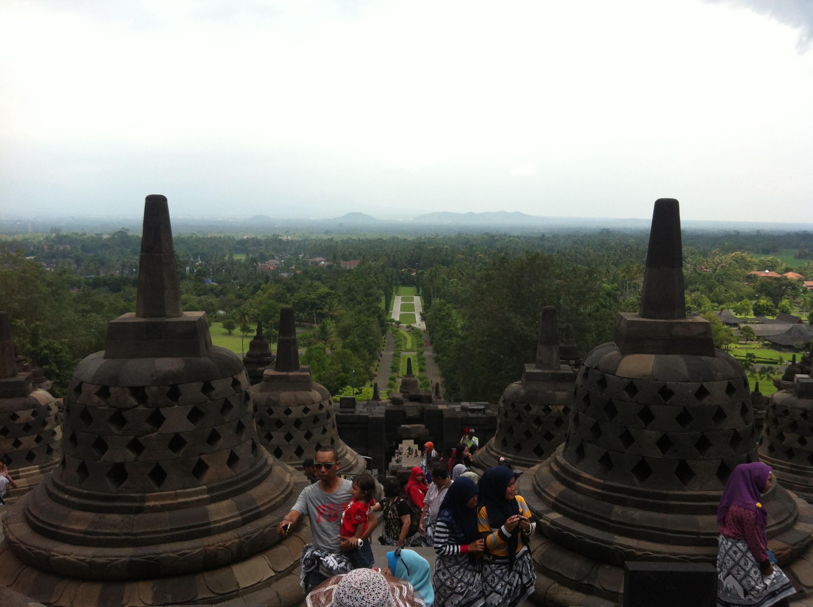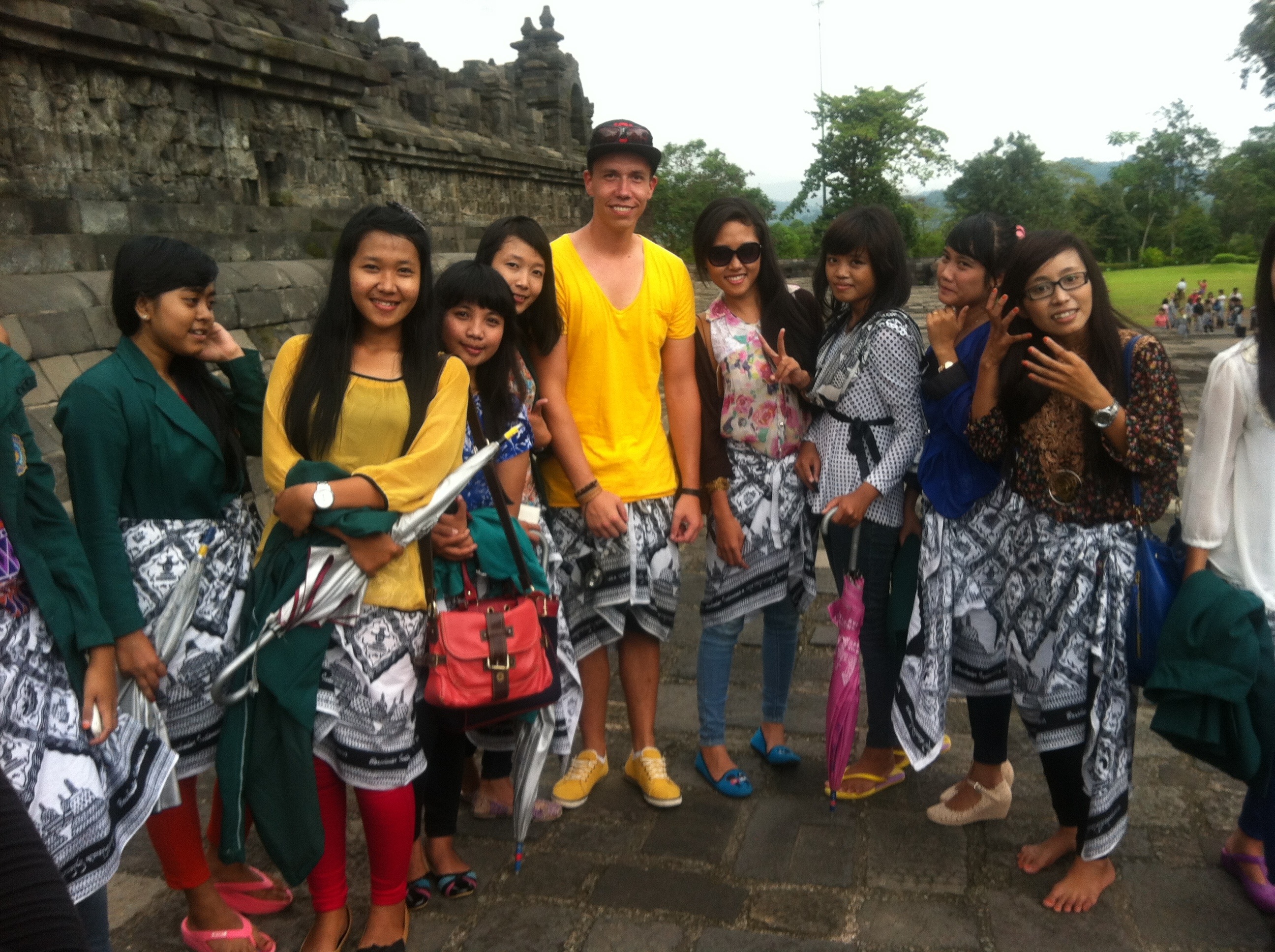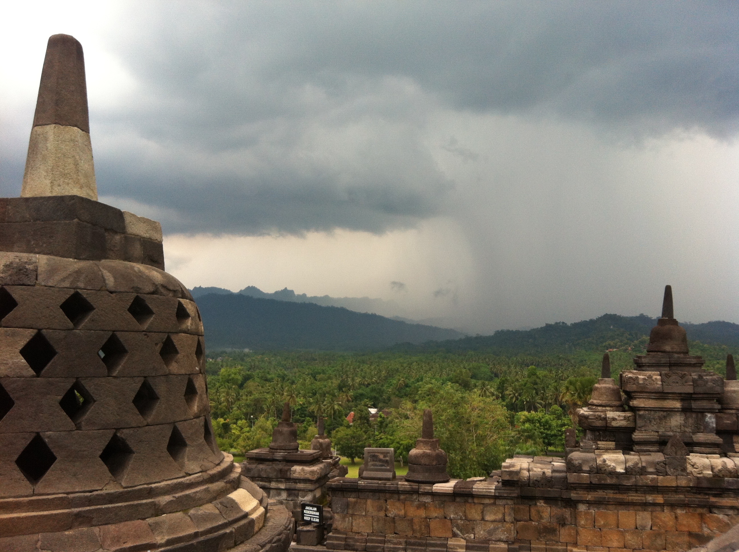Später ging es dann nach Borobudur. Mit Angkor Wat und Bagan gehört Borobudur zu den bedeutendsten Monumenten des Buddhismus. Die Anlage entstand wie Prambanan im 9. Jh. und besteht aus sechs quadratischen Ebenen und drei kreisförmigen Terrassen. Die Tempelanlage war für uns beeindruckender als die in Prambanan. Lustig waren die einheimischen Mädchen. Wir wussten nicht ganz, ob wir die Attraktion waren oder die Tempel. Zum Ende unseres Ausfluges erfuhren wir, was es heißt in der Regenzeit zu reisen.