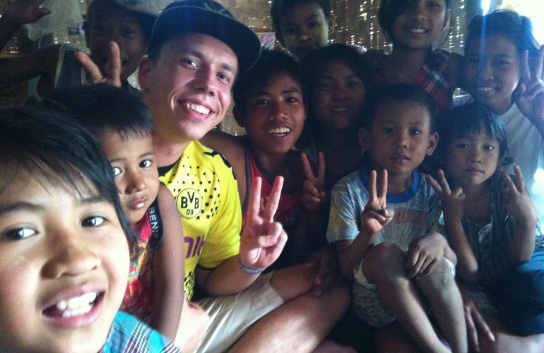 Unweit vom Flussufer habe ich zunächst eine Frau beim Waschen ihrer Kleidung und einen Mann beim Ernten seiner Zwiebeln beobachtet. Nach einer Weile kam der Mann auf mich zu. Anfangs dachte ich, dass ich unerwünscht in diesem Dorf sei. Aber ganz im Gegenteil er hatte mich auf einen Tee in seiner Hütte eingeladen. Wir haben Ewigkeiten über sein Leben, die Politik und über seine Familie geredet. Auch hier wollte ich Eric und meine Tradition weiterführen, und zwar das Verschenken von Kleidung, die wir sowieso wegwerfen würden. Außerdem hatte ich ein gefälschtes BVB Trikot in Kambodscha gekauft, was ich jemanden schenken wollte. Gesagt! Getan! Als er mich zum abendlichen Fußballspiel eingeladen hatte und er mir klarmachte, dass wir die gleiche Leidenschaft teilen, hatte er sich das BVB Trikot verdient. Seine Tochter erzählte mir wie gerne sie liest. Auch dafür war ich vorbereitet. Ich hab ihr Bücher geschenkt. Vor Freude fing sie an zu weinen. Man muss wissen, dass es nicht einfach ist an Informationen in Myanmar heranzukommen. Nach einer gewissen Zeit hatte ich alle Dorfkids um mich herum und hab sie mit dem IPhone spielen lassen. Es war so schön so viele glückliche Kinder zu sehen. Leider musste ich irgendwann weiterziehen…