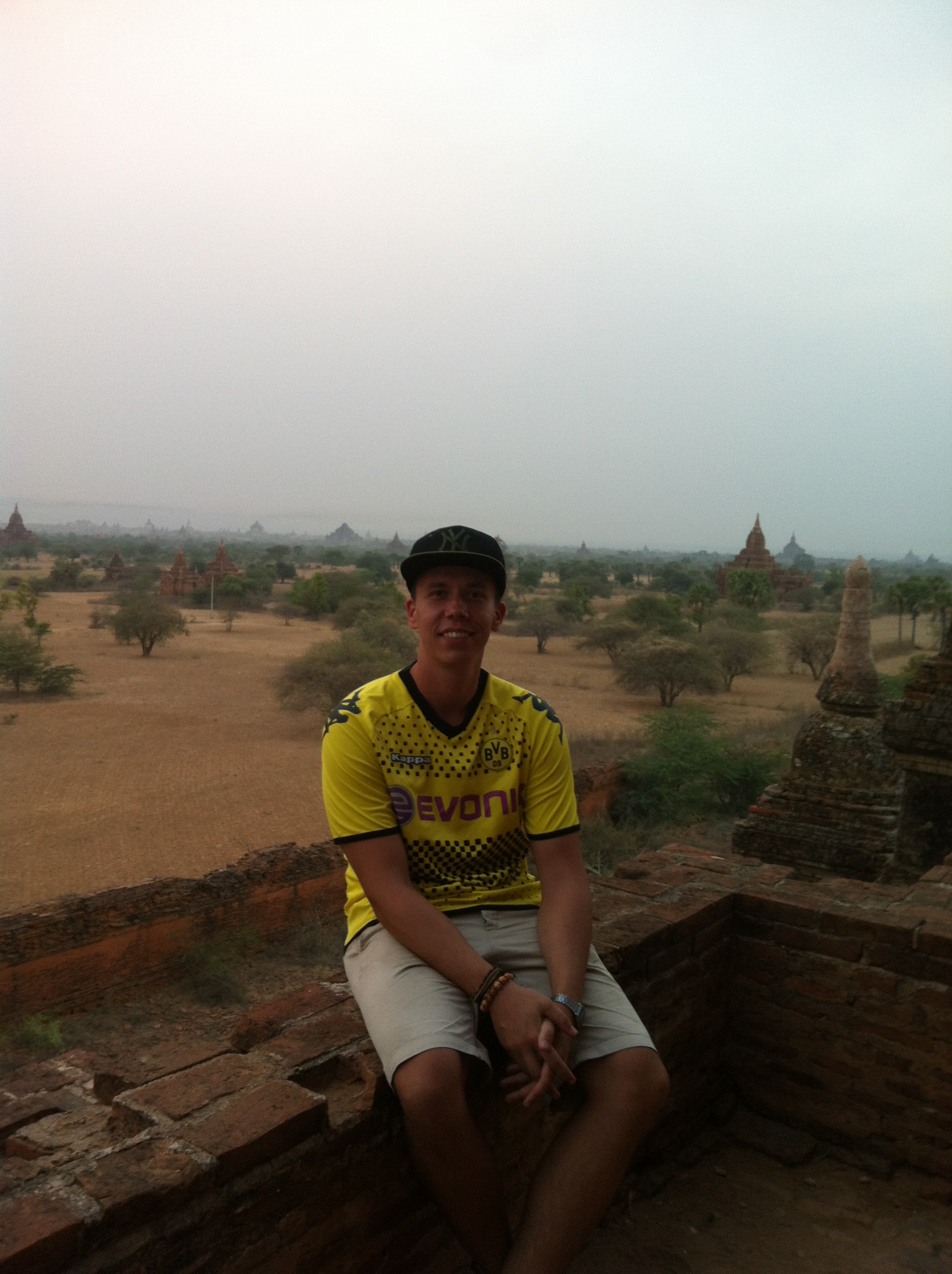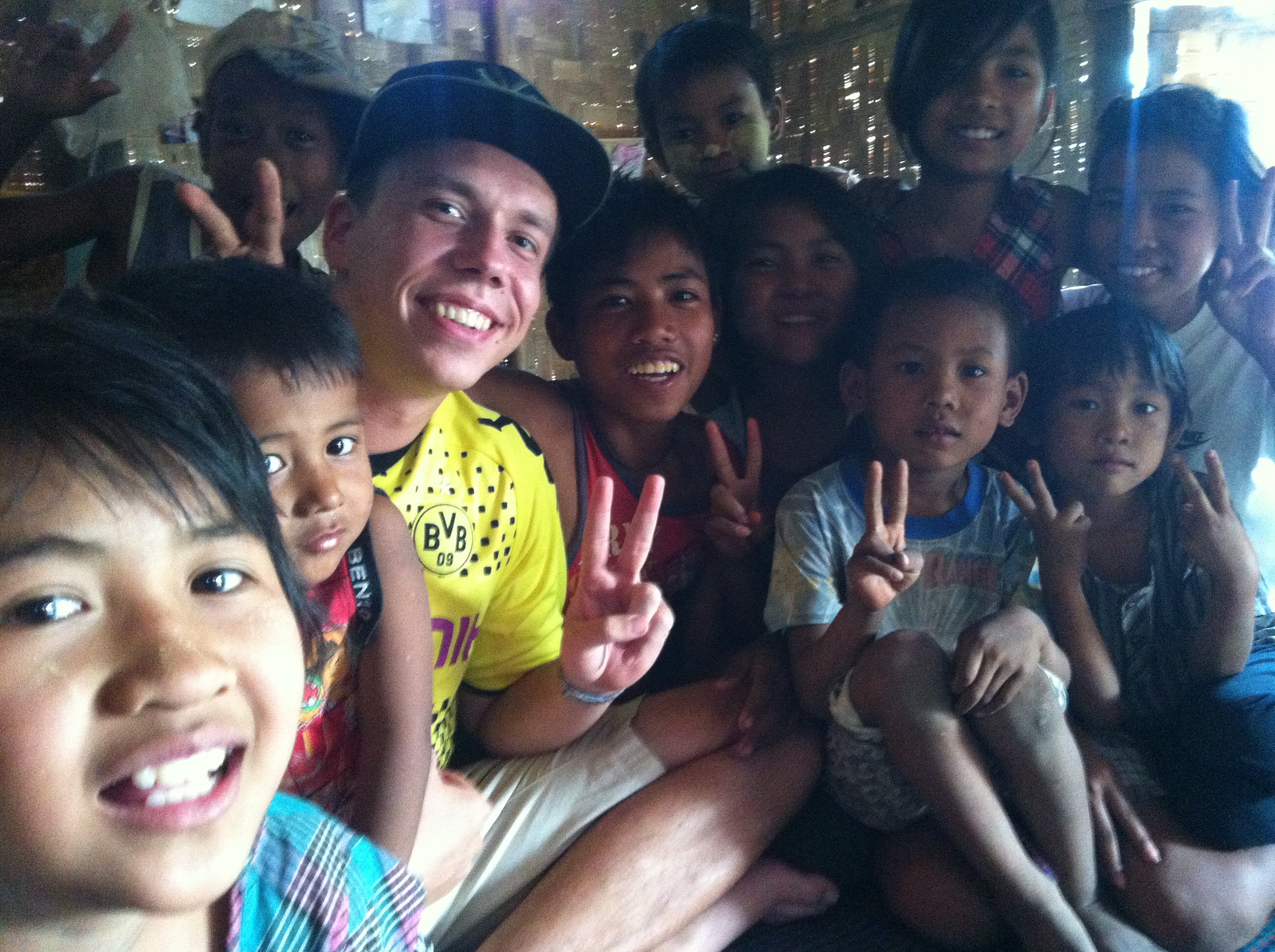 Unweit vom Flussufer habe ich zunächst eine Frau beim Waschen ihrer Kleidung und einen Mann beim Ernten seiner Zwiebeln beobachtet. Nach einer Weile kam der Mann auf mich zu. Anfangs dachte ich, dass ich unerwünscht in diesem Dorf sei. Aber ganz im Gegenteil er hatte mich auf einen Tee in seiner Hütte eingeladen. Wir haben Ewigkeiten über sein Leben, die Politik und über seine Familie geredet. Auch hier wollte ich Eric und meine Tradition weiterführen, und zwar das Verschenken von Kleidung, die wir sowieso wegwerfen würden. Außerdem hatte ich ein gefälschtes BVB Trikot in Kambodscha gekauft, was ich jemanden schenken wollte. Gesagt! Getan! Als er mich zum abendlichen Fußballspiel eingeladen hatte und er mir klarmachte, dass wir die gleiche Leidenschaft teilen, hatte er sich das BVB Trikot verdient. Seine Tochter erzählte mir wie gerne sie liest. Auch dafür war ich vorbereitet. Ich hab ihr Bücher geschenkt. Vor Freude fing sie an zu weinen. Man muss wissen, dass es nicht einfach ist an Informationen in Myanmar heranzukommen. Nach einer gewissen Zeit hatte ich alle Dorfkids um mich herum und hab sie mit dem IPhone spielen lassen. Es war so schön so viele glückliche Kinder zu sehen. Leider musste ich irgendwann weiterziehen…
