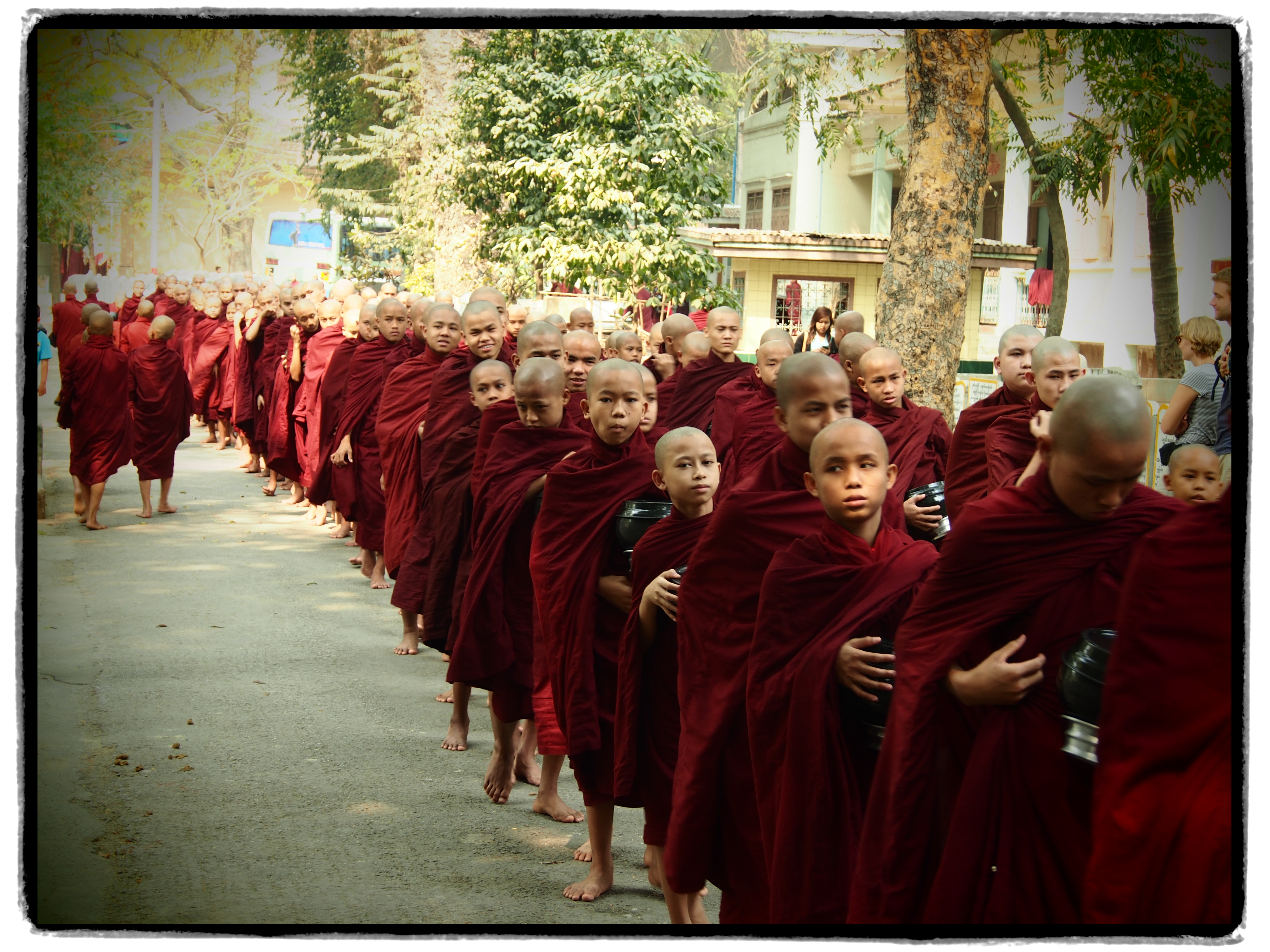 Heute haben wir die „Standard-Mandalay-Tour“ gemacht. Früh ging es zunächst nach Amarapura. Im Ganayon Kloster kann man täglich die Mönche um 10.30 Uhr beim Frühstücken zusehen. Eigentlich nicht schlecht, jedoch konnten wir es nicht genießen. Für viele Touristen haben wir uns fremdgeschämt, da sie die Mönche wie Zootiere behandelt haben. Gegen ein unauffälliges Foto wird sicherlich niemand etwas dagegen haben…