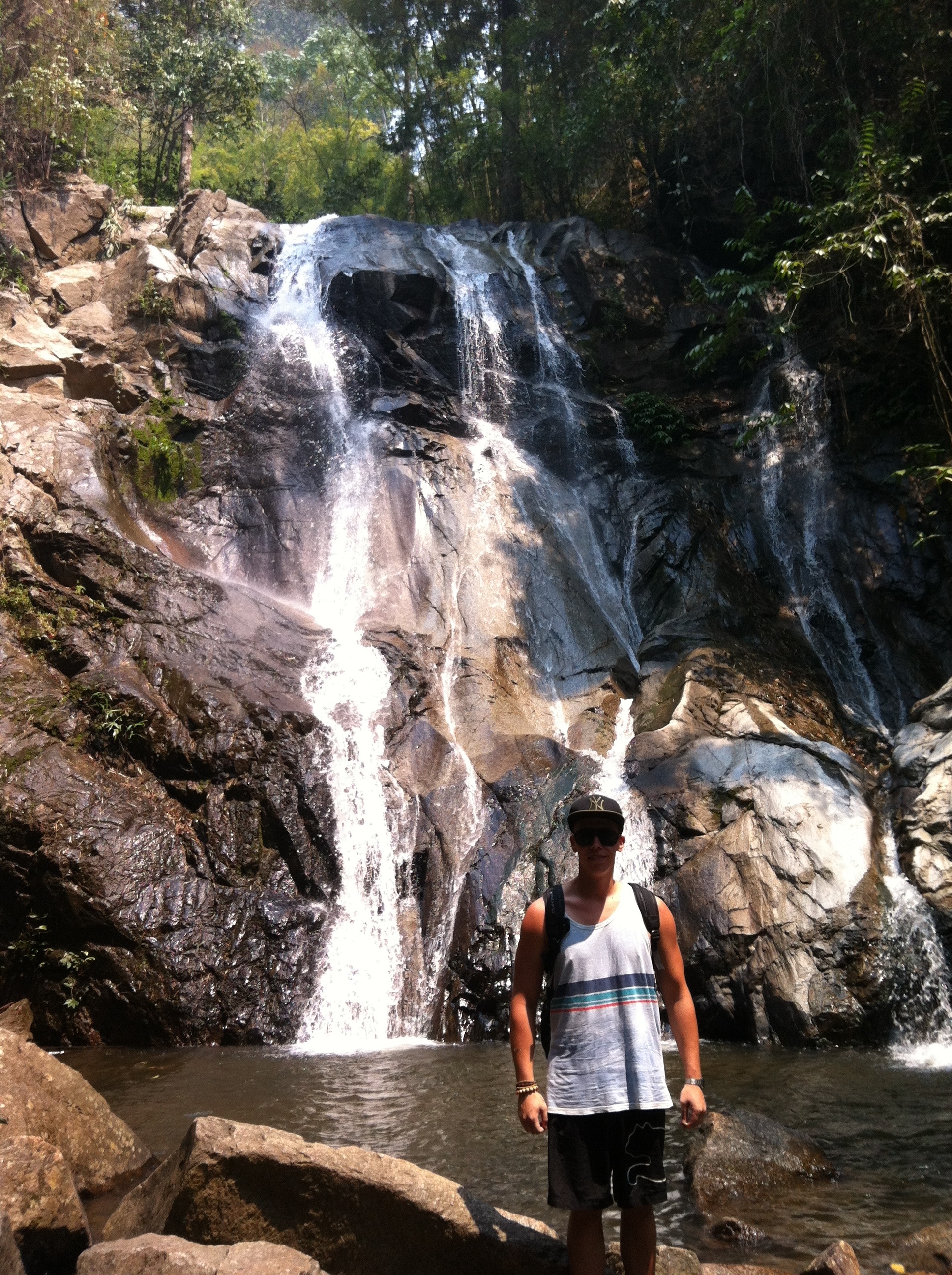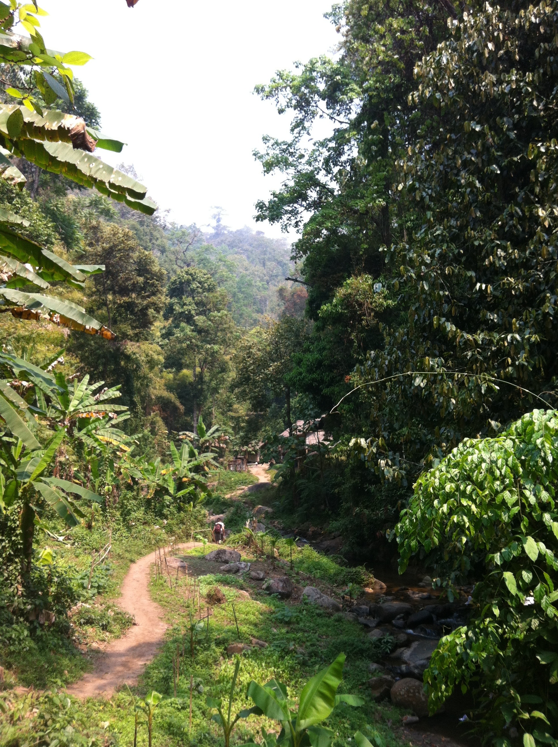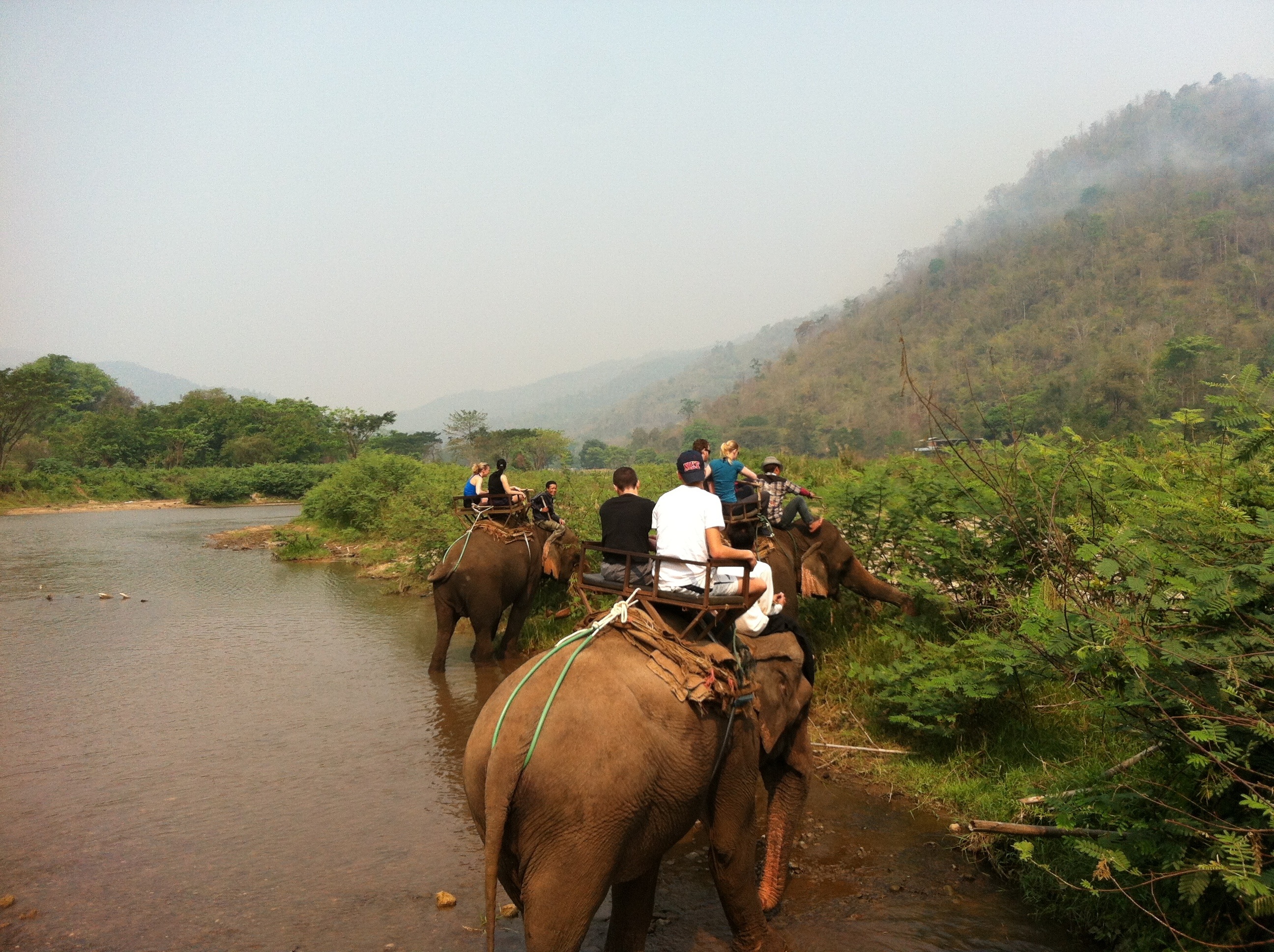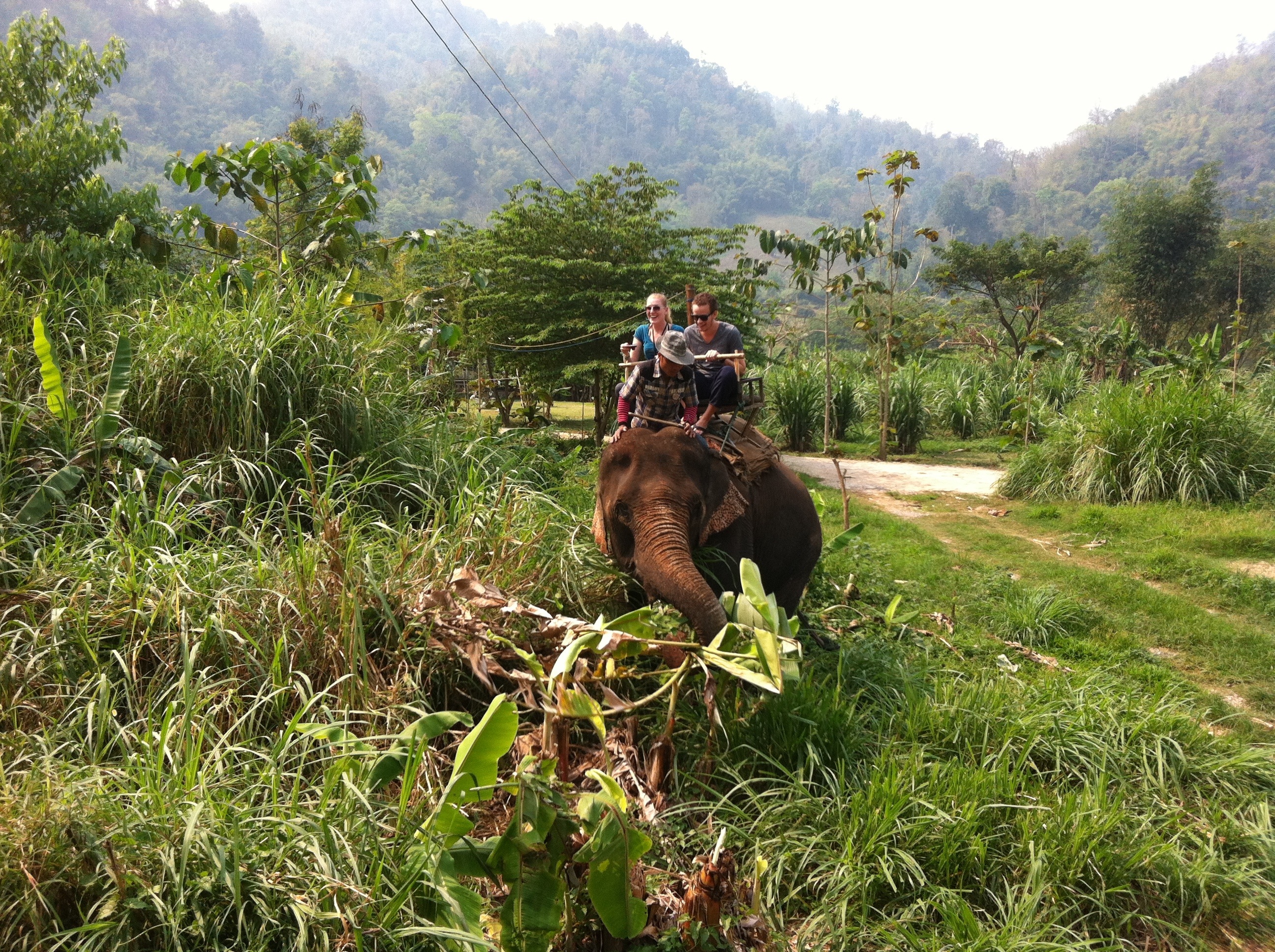 Der Einfachheit halber habe ich mir gestern eine Tour in den Dschungel gebucht. Zuerst ging es zum 1-stündigen Elefantenreiten. Danach sind wir durch den Dschungel zu einem Wasserfall gewandert. Der Pfad war leider nicht so anstrengend wie erwartet, dafür aber ziemlich schön. Als nächsten Programmpunkt stand Rafting auf der Tagesordnung. Da das Wasser ziemlich flach war, hatten wir keinen stark strömenden Fluss. Die paar Stromschnellen, die wir passiert haben, waren jedoch schon anstrengend genug. Danach ging es zum Bamboo Rafting. Das war ziemlich langweilig. Man lässt sich einfach auf einem Bambusfloß den Fluss heruntertreiben. Letztlich sind wir zu einem traditionellen Dorf der Akha gefahren.