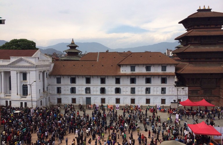 Der Durbar Square ist das kulturelle Zentrum mit einer Vielzahl von Palaesten und Tempeln. Man sollte hier unbedingt eines der Dachterrassencafes ausprobieren, um die Palaeste vor dem Bergpanorama bestaunen zu koennen.