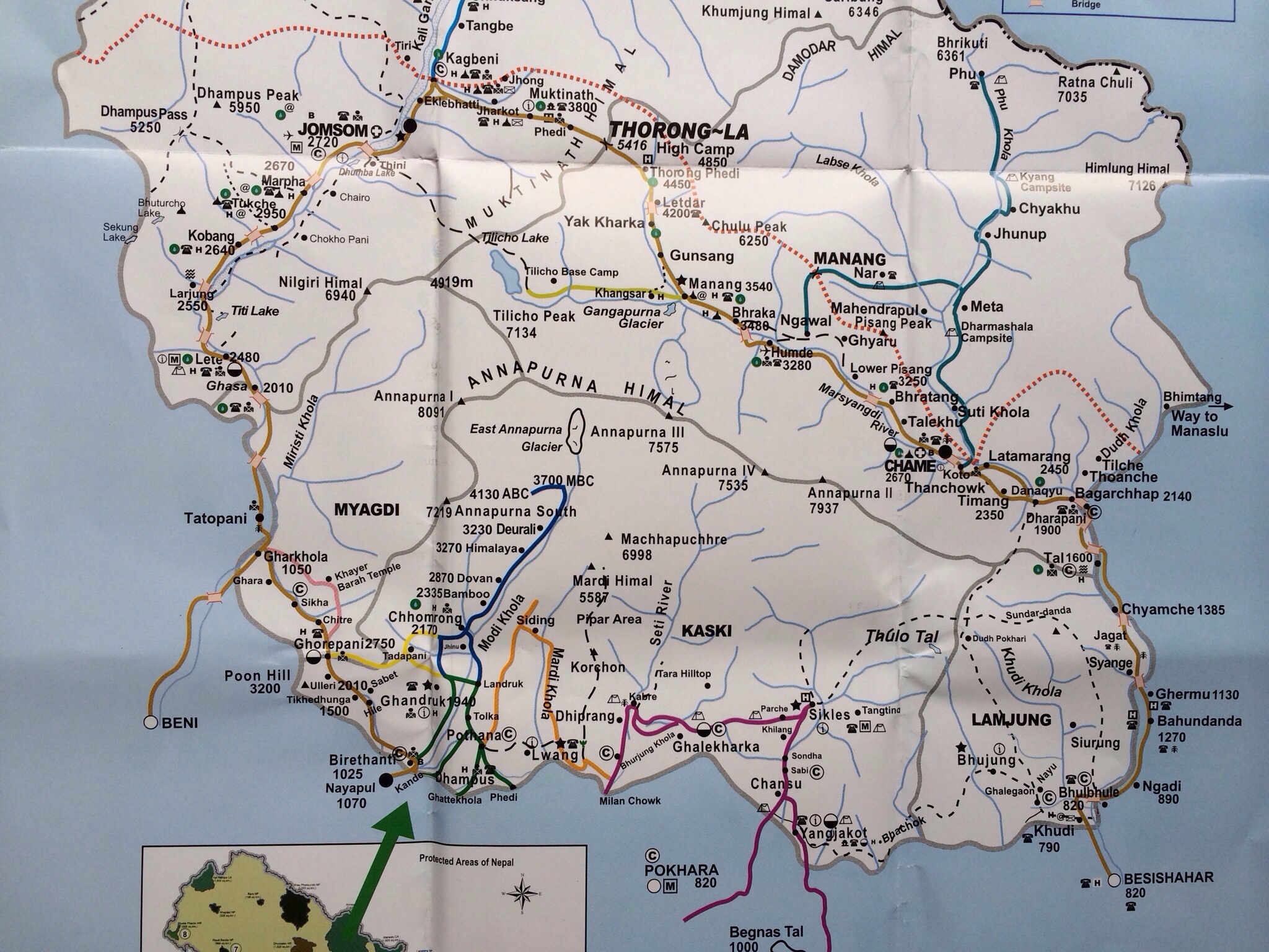 Annapurna ist der groesste Nationalpark Nepals und wahrscheinlich auch der meist Besuchteste. Benannt ist der Nationalpark nach den 4 gleichnamigen Bergen. Der Hoechste davon ist 8091 m und ist der zehnt hoechste Berg der Welt. Wir werden den Annapurna Circuit Trek von Chamche nach Muktinath laufen (der braune Wanderweg auf der Karte). Dieser Wanderweg fuehrt einmal komplett um die 4 Annapurna Berge.