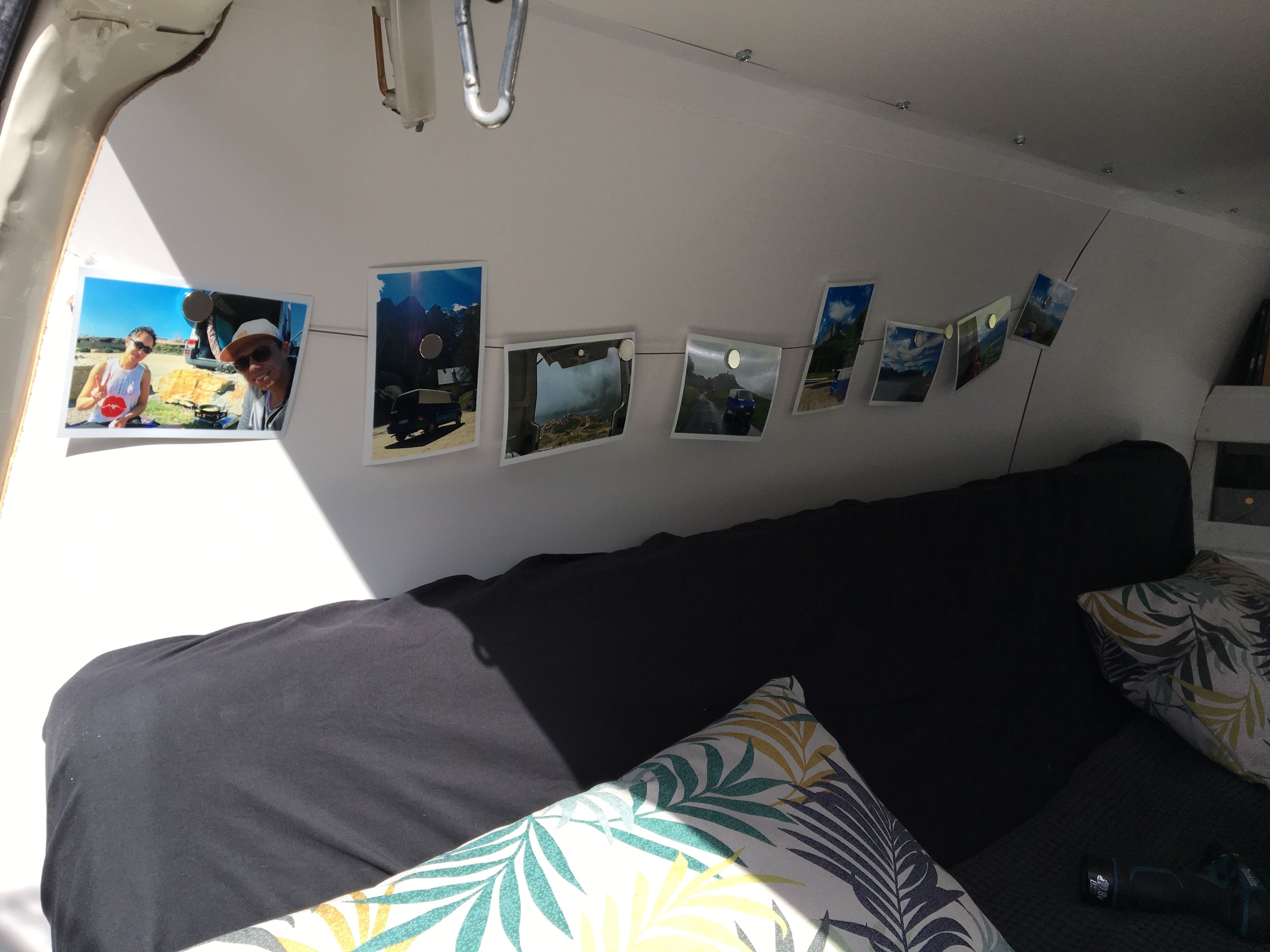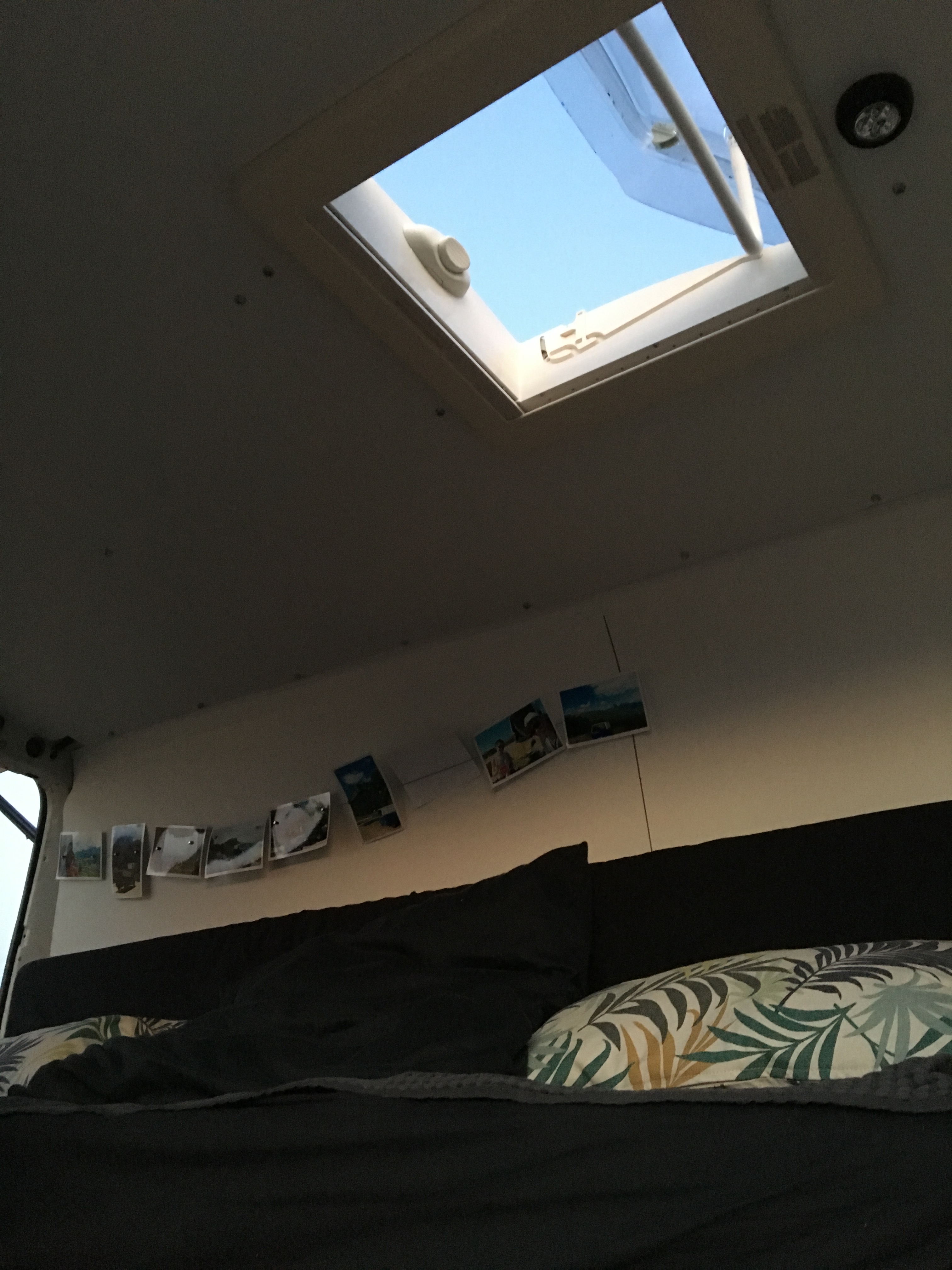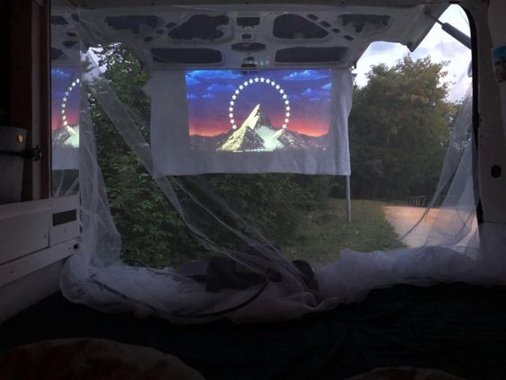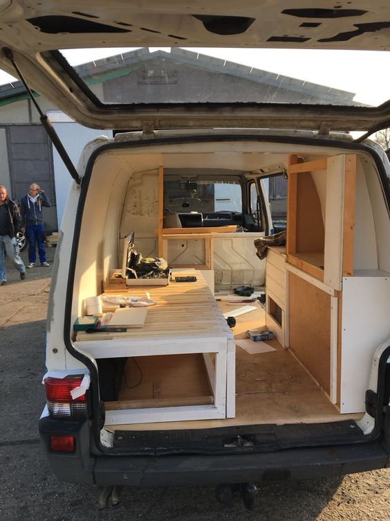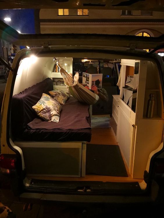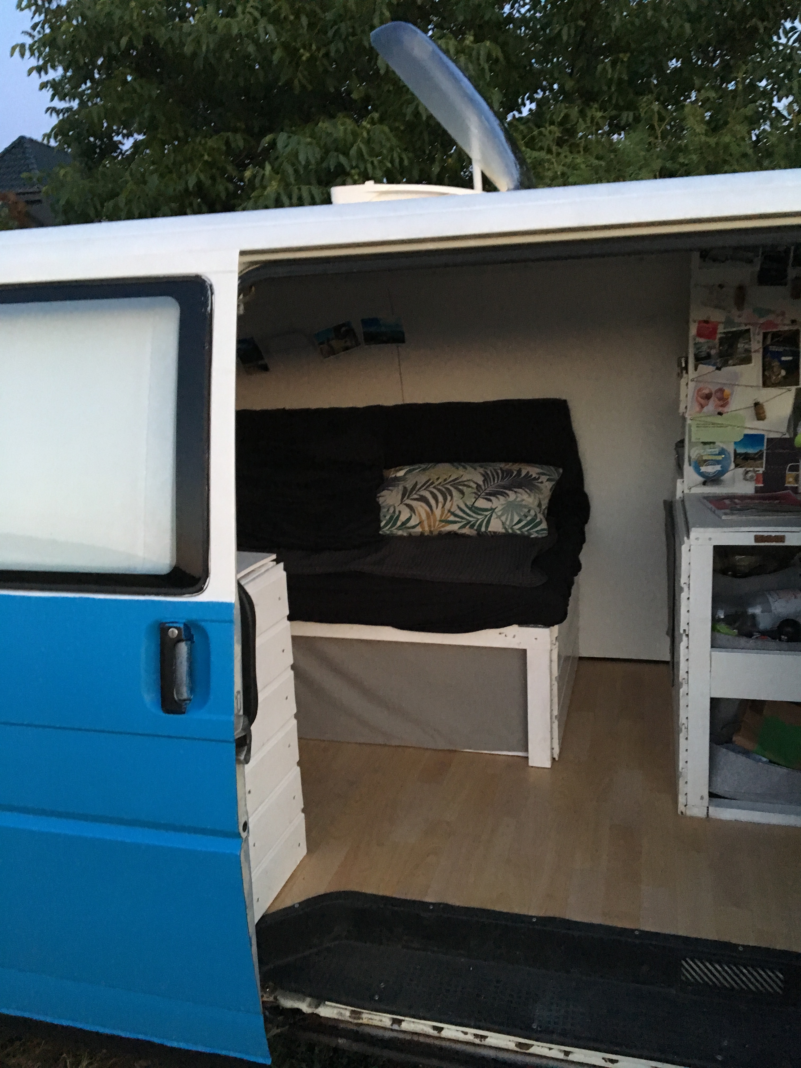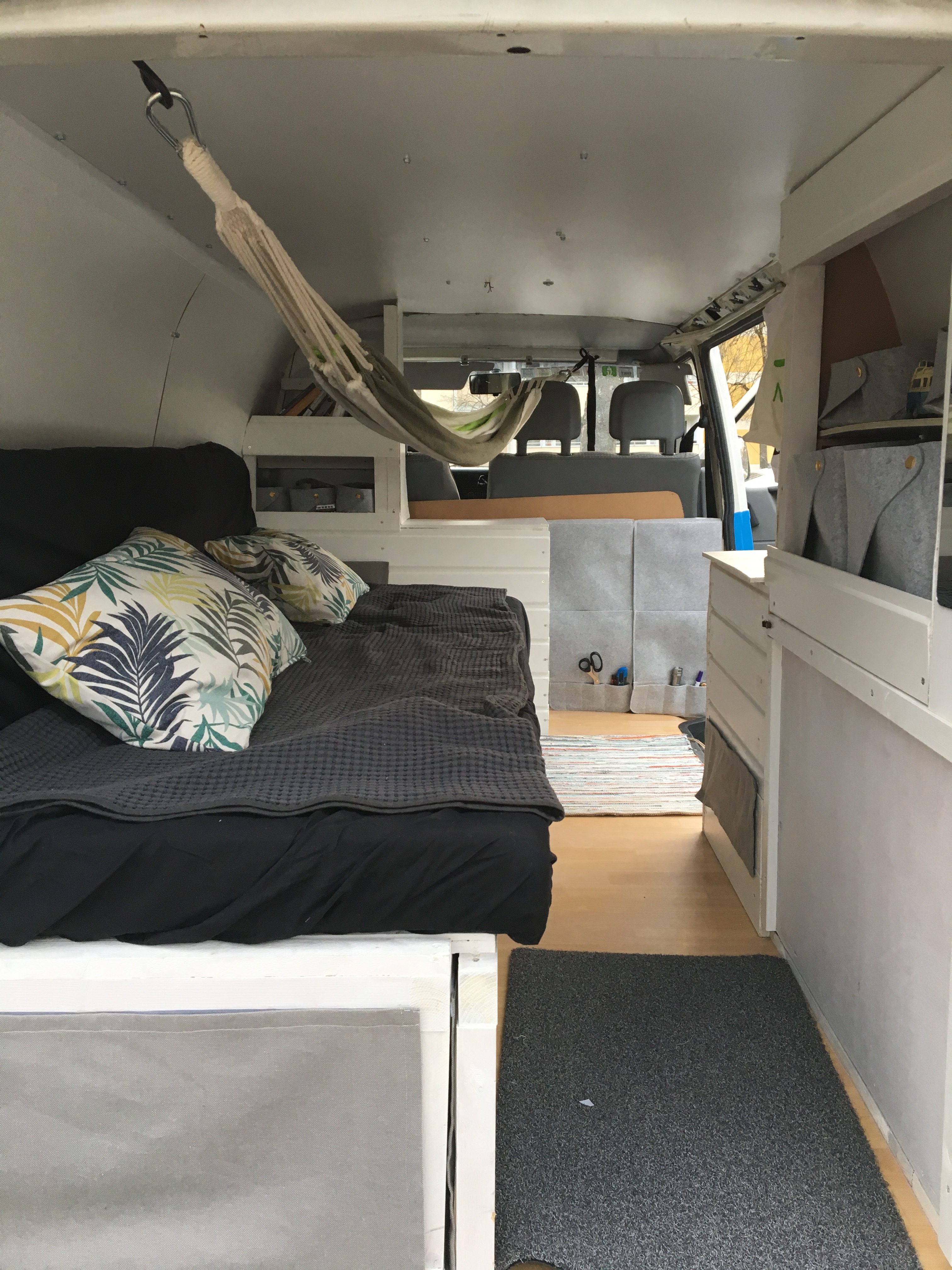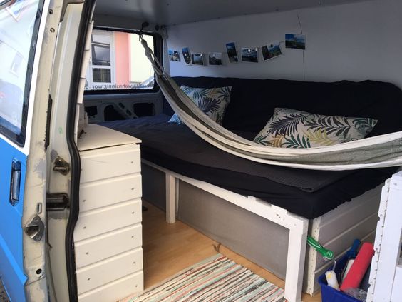 Erst habe ich sie isoliert und den Rost von der Karosserie entfernt. Danach wurde ein Holzboden mit Linoleum verlegt. Die Schiebetür wurde gegen eine andere mit Glas ausgetauscht und ein Teil der Trennwand wurde abgeflext. Dann habe ich das ausziehbare Bett gebaut (im Nachhinein würde ich lieber ein klappbares Bett bauen). Im nächsten Schritt habe ich die Seiten- und Deckenplatten angebracht. Der seitliche Schrank sollte nur teils über die volle Höhe des Vans gehen, sodass es von innen nicht zu voll wirkt. Am niedrigeren Teil des Schrankes habe ich eine Kreidewand gebastelt. Der Schrank an der Rückseite sollte auch nur teils über die komplette Höhe gehen. So kommt mehr Licht ins Auto. Einen weiteren Traum, den ich mir erfüllt habe, ist das Dachfenster. Somit kann man im bettliegend die Sterne sehen. Meine Hängematte findet bei eingezogenem Bett glücklicherweise auch Platz und mein Mini-Beamer wurde auch schon erprobt. Wir haben jetzt ein mobiles Open-Air Kino. Den kompletten Fortschritt des Umbaus findet ihr auf Pinterest.