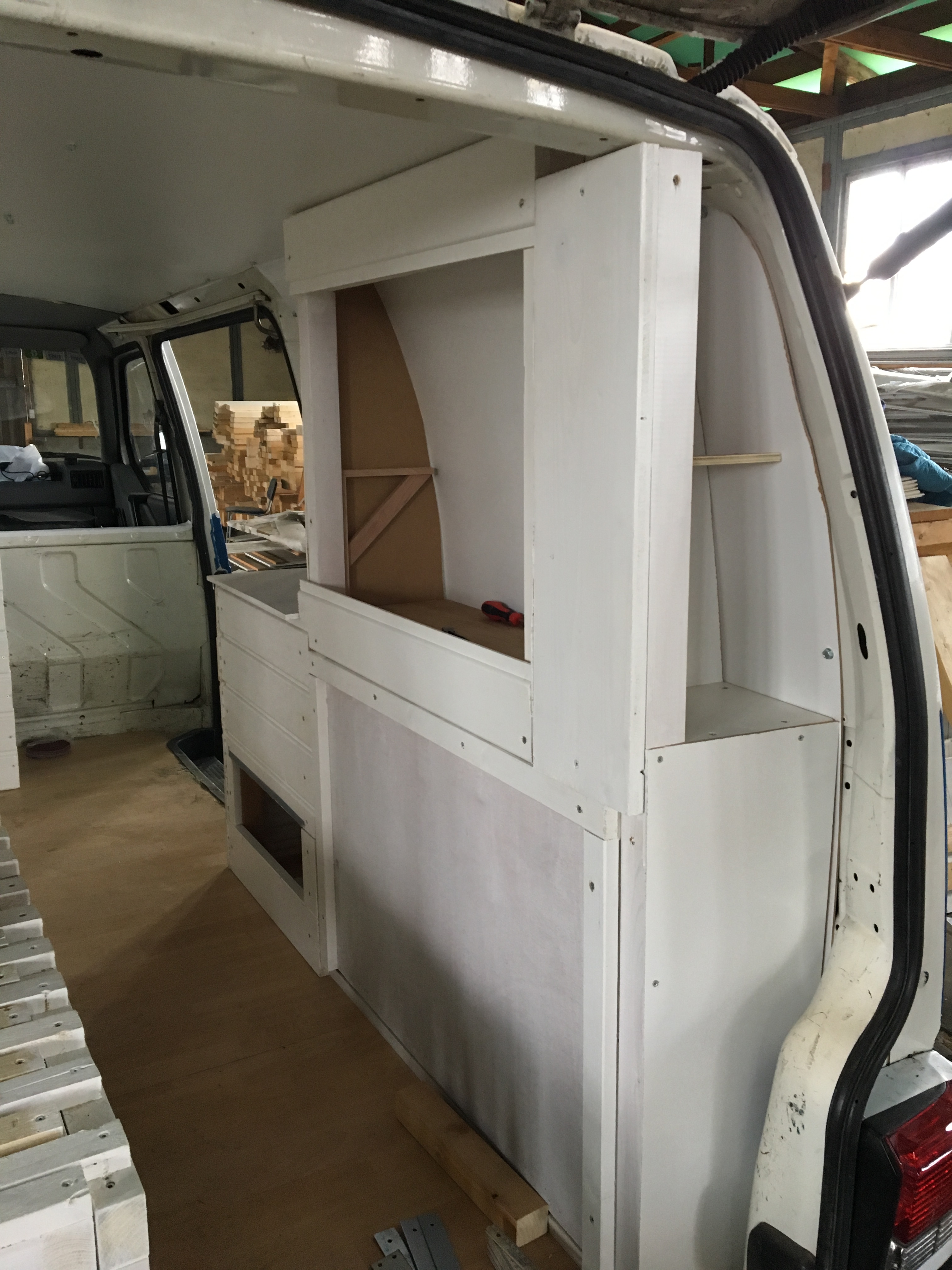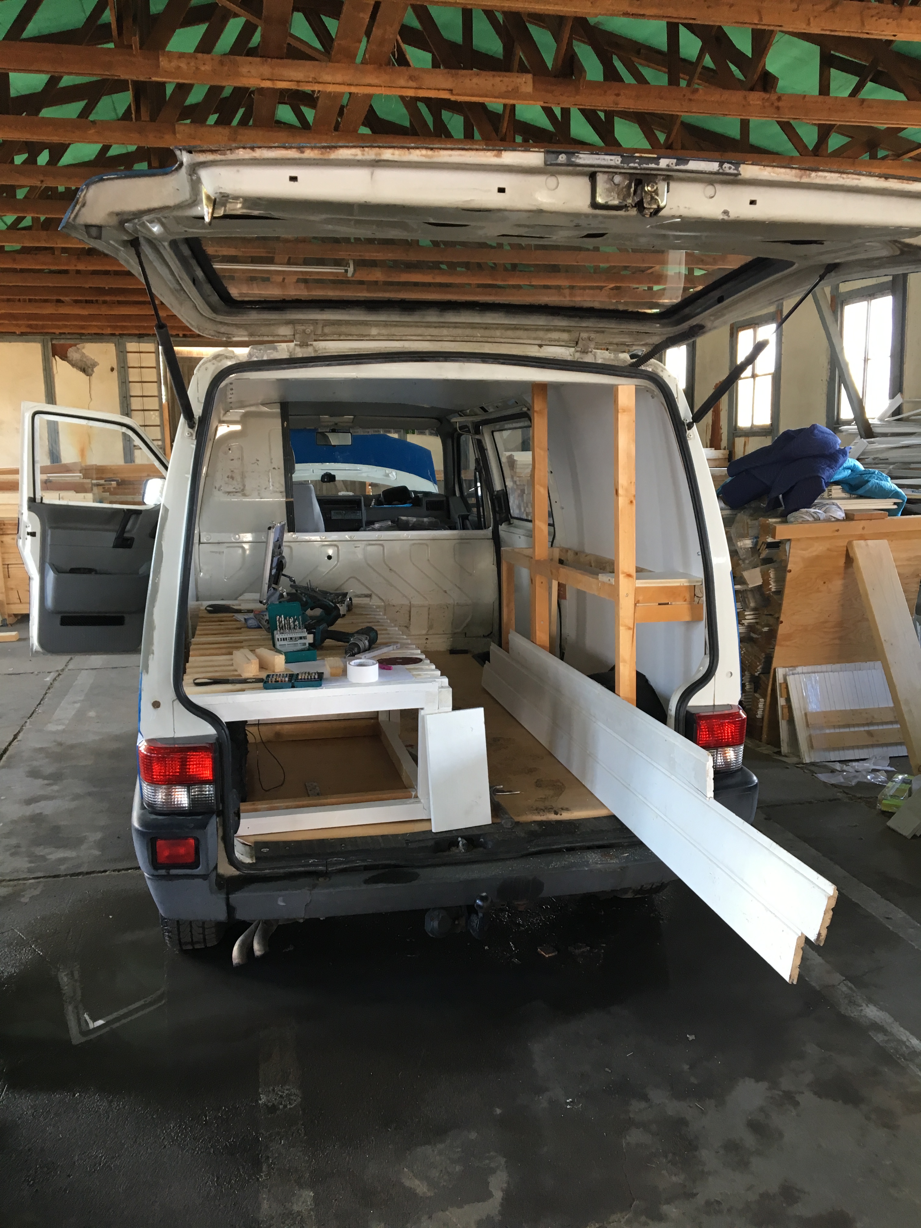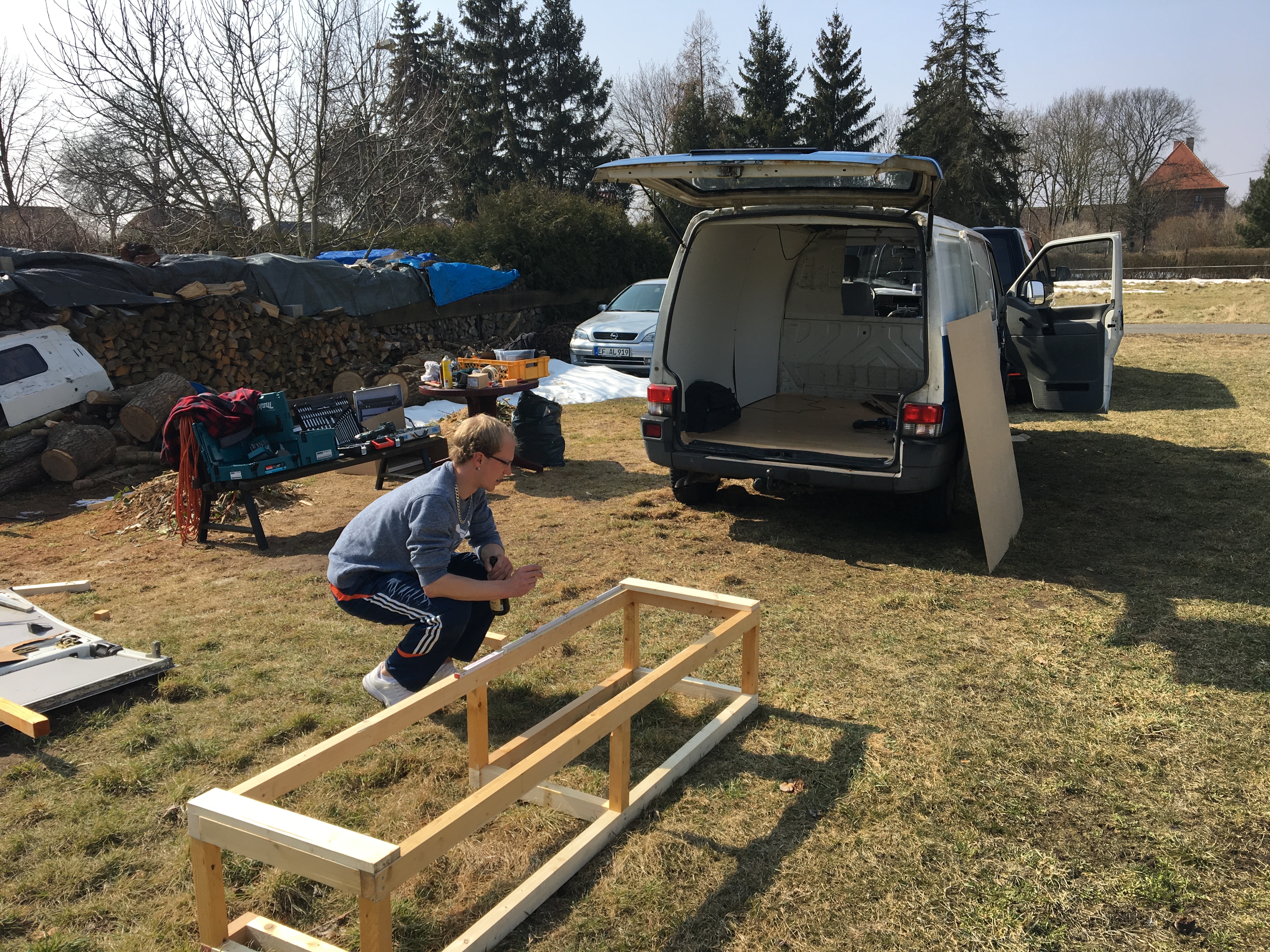 Mit wenig Handwerkererfahrung und kaum Geld wollte ich nun mein Van-Projekt realisieren. Zum Glück habe ich im Bekanntenkreis jemanden gefunden, der viel Holz aus seiner Bauunternehmung rumliegen hatte. Ostern 2018 habe ich mir dann eine Woche freigenommen und 5 Tage täglich 14 h geschuftet und zack war die Emma 2.0 fertig.