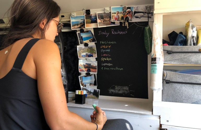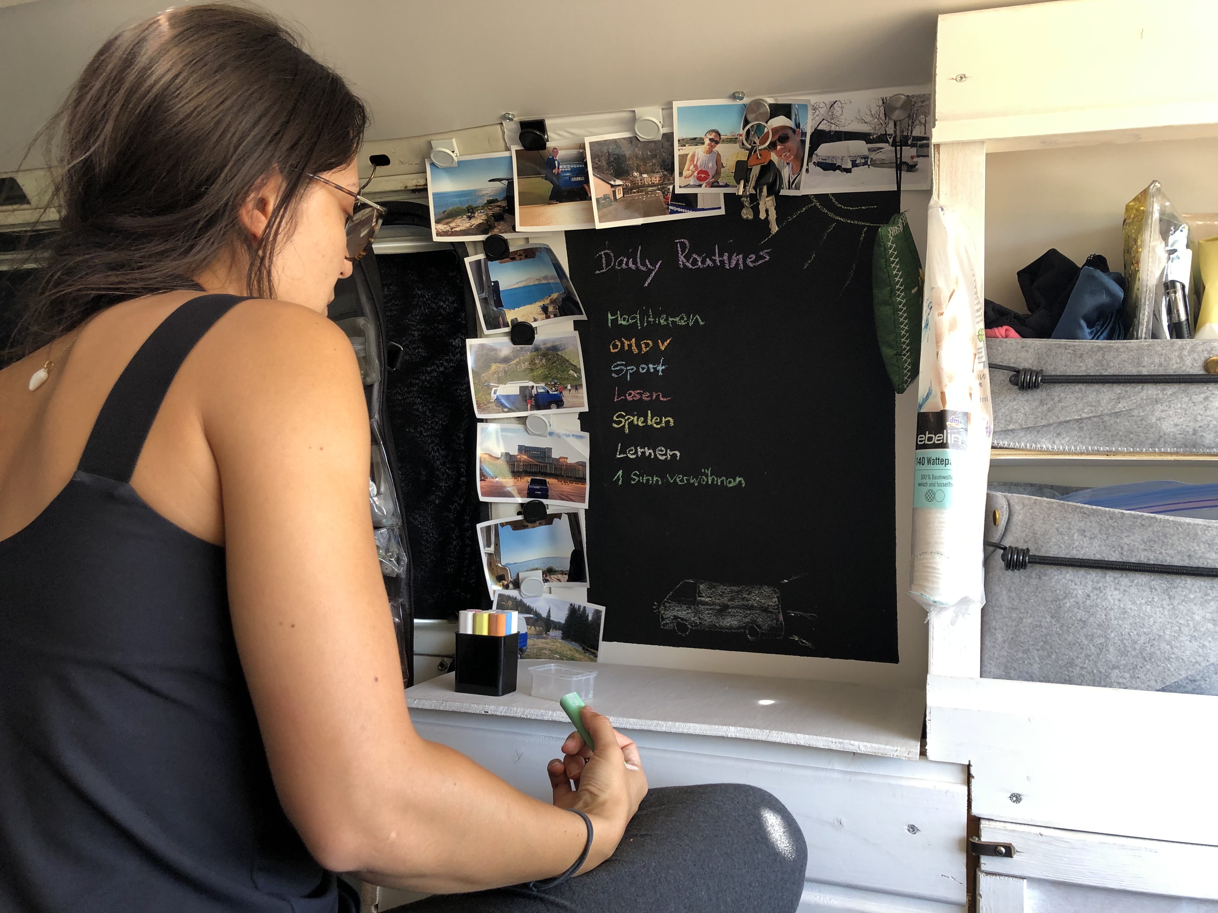 In unserem Van „Emma“ haben wir an der Wand eine Tafel. Diese nutzten wir, um unsere „Daily Routines“ niederzusschreiben. Wir fragten uns, was uns bereits Zuhause in München wichtig war und was die Qualität unseres Lebens steigern würde. Nach 10 Minuten brainstormen, entschieden wir uns für folgende 10 Dinge: Meditieren, eine vegane Mahlzeit am Tag, Sport, Lesen, Lernen, Spielen, Lachen, etwas schenken, sinnieren und einen Sinn verwöhnen.