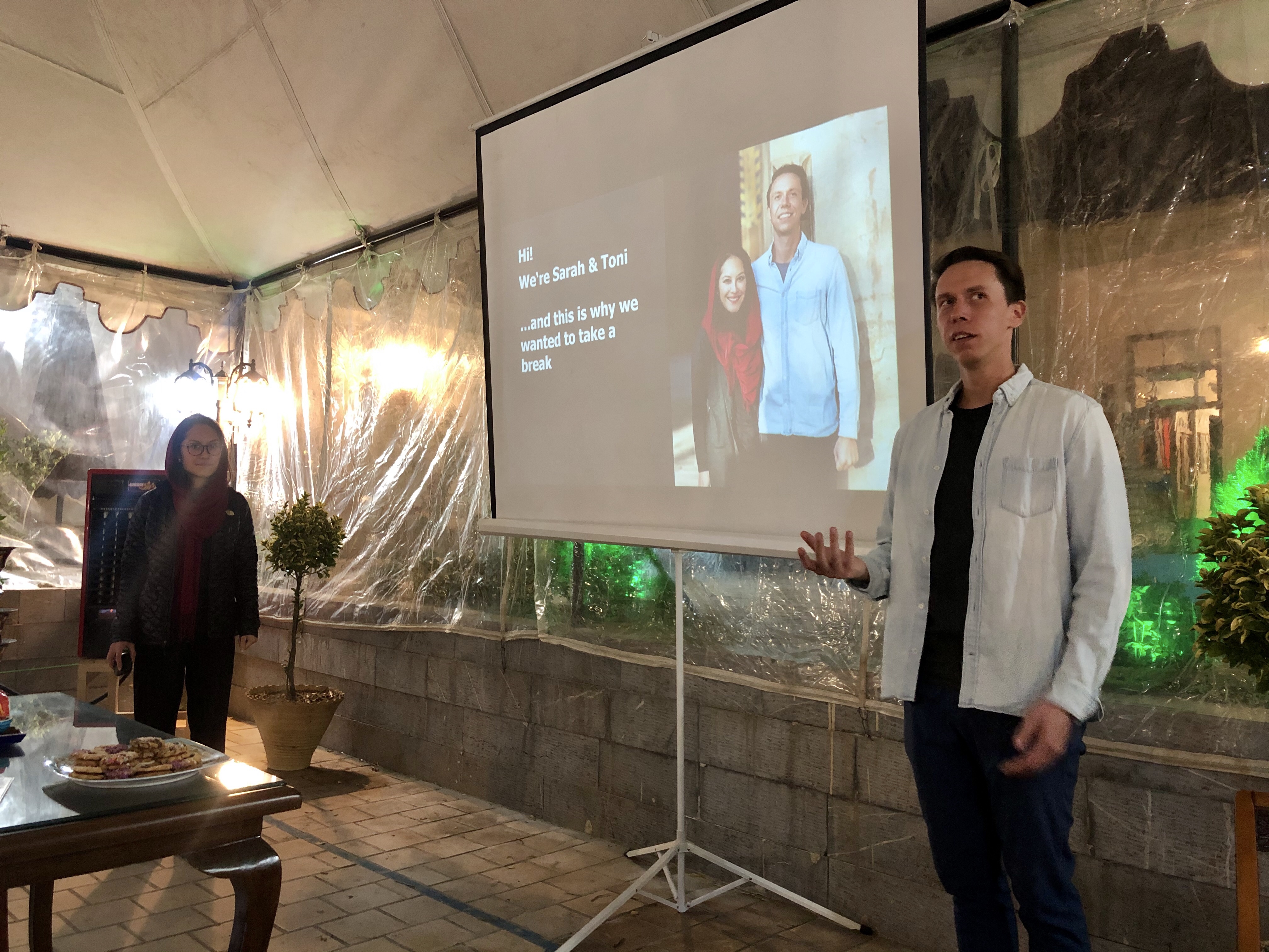 Story: Isfahan bzw. Esfahan ist DIE Kulturhauptstadt Irans. Unzählige Paläste, weitläufig angelegte Straßen und Parkanlagen, sowie Moscheen bestückt mit Mosaikfließen… Kein Wunder, dass wir mal wieder gebummelt haben und ganze 7 Nächte hier waren. In unserem Hostel haben wir eine junge Gruppe iranischer Unternehmer kennengelernt, die tatkräftig an ihrem Start Up arbeiten. Das war unsere Chance! Als Consultants mit Hang zur Digitalisierung konnten wir hoffentlich tatkräftig unterstützen. Von allen Dingen mir fehlt es unternehmerisch tätig zu sein, so habe ich liebend gerne mit den Jungs über Finanzströme und Unternehmensformen philosophiert. Außerdem haben wir ein Video gedreht und haben dabei kostenfrei eine Stadtführung bekommen. Überrascht wurden wir mit einer Silvesterparty. Wie cool! Iraner feiern das Neujahr erst im März, aber für uns wurde eine Ausnahme gemacht 🙂 Und erst vor ein paar Wochen haben wir in unserem Review festgehalten, dass wir gerne einen Reisevortrag halten möchten. Also haben wir direkt zum Start des neuen Jahres unseren Wunsch in die Tat umgesetzt. Erst habe ich über meine Tuk Tuk Tour durch Indien referiert und anschließend haben Sarah und ich von unserem Sabbatical erzählt. Unser Aufenthalt ähnelte vielmehr einem Workaway. Deshalb durften wir hier auch umsonst übernachten. Geplant war das nicht, eher „go with the flow“, auch wenn mir das oft schwer fällt.